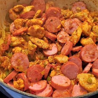 Ingredients: 2 lbs skinless boneless chicken breast, cubed 12 ounces Kielbasa (smoked sausage), thinly sliced 1 lb medium shrimp, peeled and deveined 1 tablespoon bacon grease (or extra-virgin olive oil) 1 bell pepper, cleaned and diced 1 onion, diced